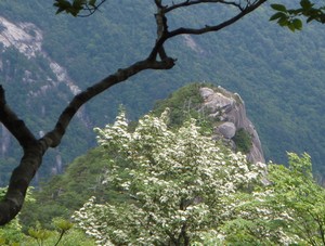 ◆下山時、○○桜?越しに小積ダキが見えています :小積ダキ突端の岩上で一時の休憩です(*^_^*)