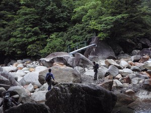 ◆大崩山荘前の祝子川を石伝いに徒渉します :同ヶ所よりふり返ると小積ダキが見えていました。
