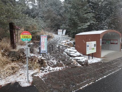 | ▼雪の舞う大浪池登山口の駐車場 | ▼避難濠の設置された大浪池登山口 | |