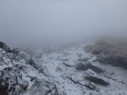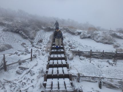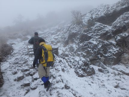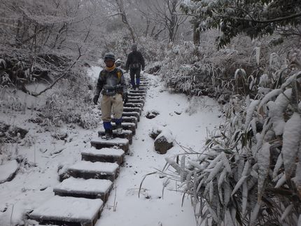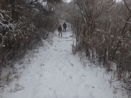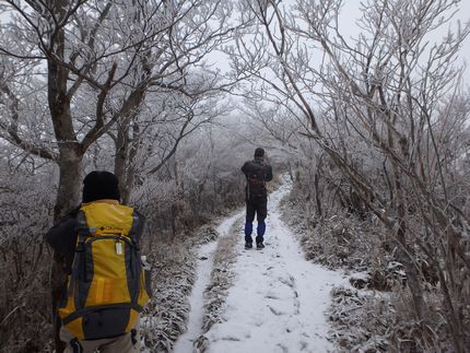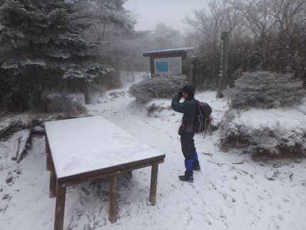 | ▼韓国岳山頂は強風でみぞれが顔に突き刺さる感じで早々に下山です | ▼樹林帯へ下りてくると風が弱まりました。 | |