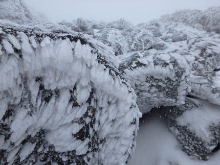 | ▼みぞれ混じりの強風にあおられます。 | ▼岩に付いた氷だから・・・岩氷!? | |