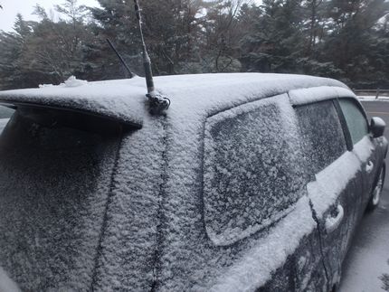| ▼大浪池から雪道を下山します | ▼駐車場の車は雪と氷で凍っていました。 | |