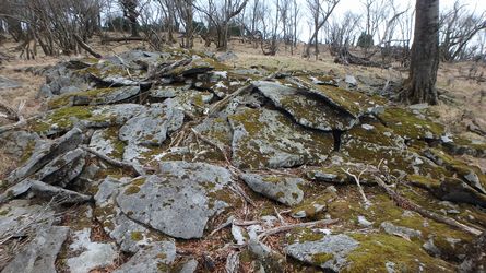 | ▼昼食後、往路を戻り下山します。 | ▼途中、石片が積まれた状態を見ましたがここだけ??? | |