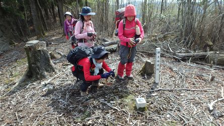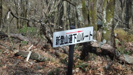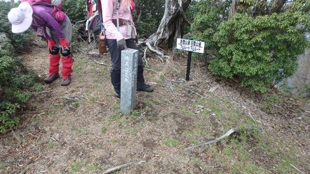 | ▼稜線に設置された、標高1238.9mの4等三角点 | ▼川の口からの旧ルートに合流しました。 ※川の口地区からバクチ石ヶ所に上がる新ルートが整備されました。 |
