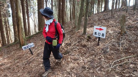 飯干山から馬口岳へつながる稜線を伝い馬口岳を目指す読図コースで、飯干峠から川の口方面へ約1.4km下った地点から飯干山の北尾根に取り付き、藪こぎしながら登ると鹿除けネットが現れネット伝いに下ると地形図記載の林道が現れたので林道崩壊箇所まで林道を歩き馬口岳稜線に上がる。