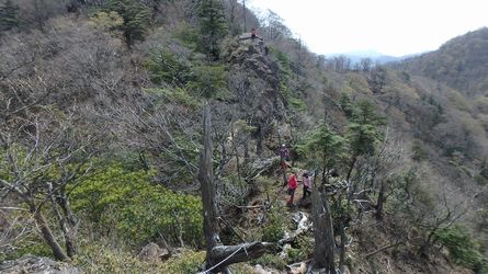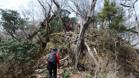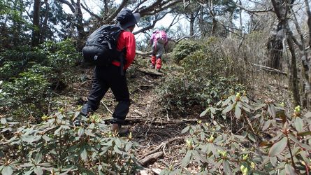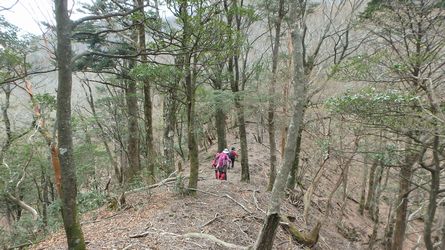 | ▼展望岩から下ります | ▼続いて稜線伝いで、津野岳(江代山)へ向います。 (稜線は九大演習林との境界です) |