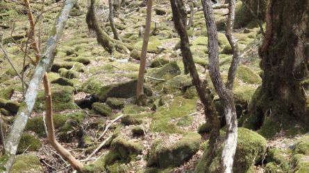 | ▼苔むした心地良い空間が広がります。 | ▼小休止です〜1558mピークへ上がってきました。 | |