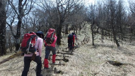 | ▼稜線を進むと正面に津野岳(江代山)が見えてきました。 | ▼最後の登りは朽ちかけた木製の階段です。 | |