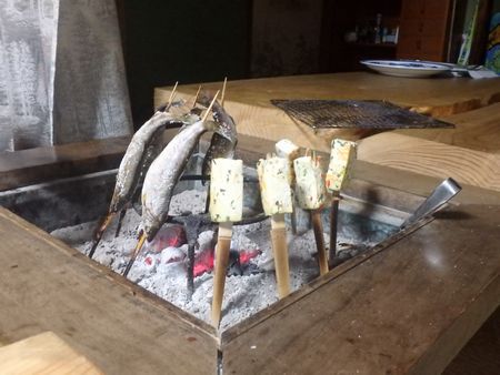 ▼ヤマメや菜豆腐の田楽が炭火焼きで頂けます。 ご主人お手製の食前酒も頂けました! |