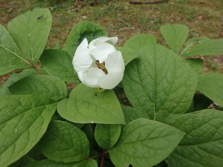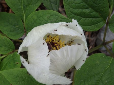 | ▼わずかに残っていた、ヤマシャクヤクの白い花です♪ | ▼ヤマシャクヤクの花に虫が集まっています | |
