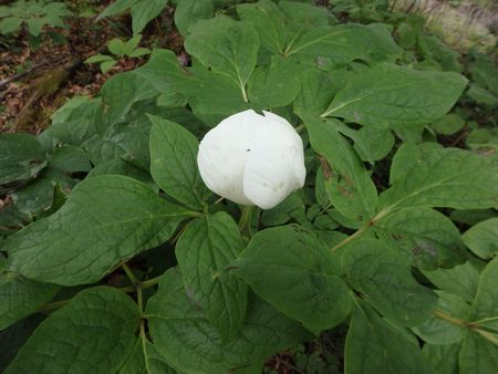 | ▼白鳥山のドリーネヶ所はヤマシャクヤクが見られます。 | ▼ドリーネヶ所に咲くヤマシャクヤクの白い花 | |