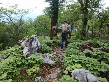 | ヤマシャクヤクの最盛期は過ぎほとんど種が付いていました・・・五月上旬〜中旬が見頃だったと思われます。 明日は、峰越から県境伝いでシャクナゲの群生する、烏帽子岳(1692m)へ登ります・・・ムニュムニュ〜オヤスミナサイ♪ |