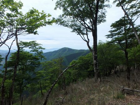 | ▼稜線で今から向う銚子笠が指呼の間に見えています | ▼前述の林道が稜線を横切り銚子笠方面へ延びています | |