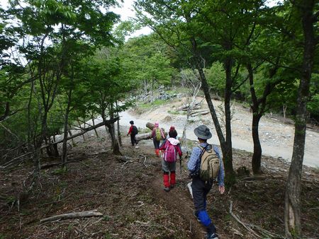 | ▼時雨岳山頂目指して登山道を上ります | ▼林道が登山道を寸断して白鳥山方面へ延びています | |