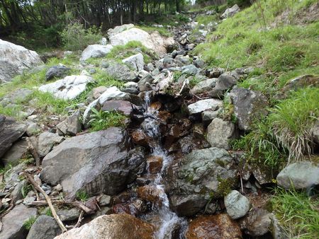 | ▼前述の林道を終点まで歩き白鳥山の山腹に取り付きます。 | ▼白鳥山の南斜面に水場を発見しました。 | |