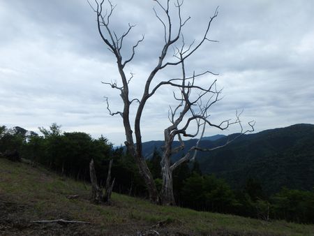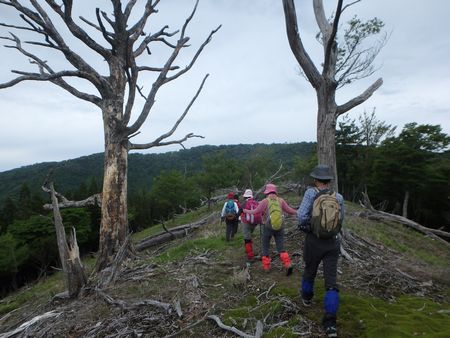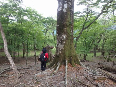 | ▼銚子笠稜線に立つ大きな枯れ木です。 | ▼稜線ではブナの巨木を多く目にします | |