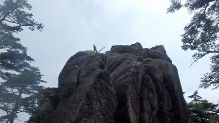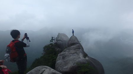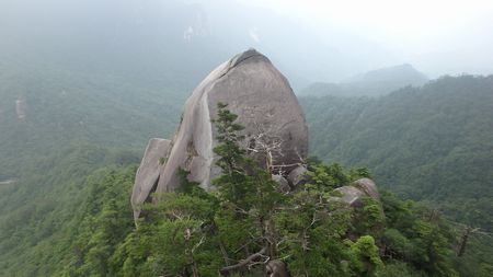 | ▼上ワクの基部より天辺の登山者を望む | ▼上ワク塚に上がると特異な容の『七日廻り岩』が見えます | |