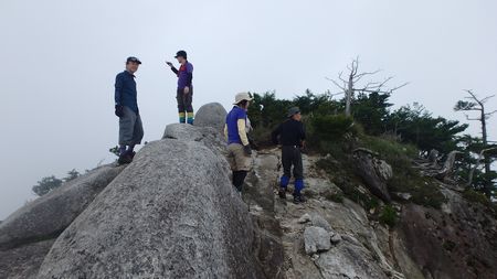 | ▼大崩山の山頂到着〜引き返して石塚で昼食です。 | ▼石塚からの眺望を楽しんでいます。 | |