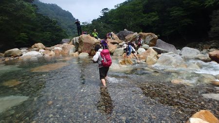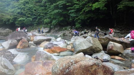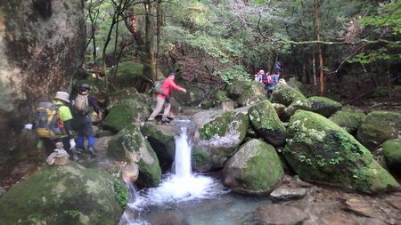 | ▼そそり立つ小積ダキの雄姿 | ▼岩伝いに祝子川を渡渉します 【注意】※増水時は渡れません!! |