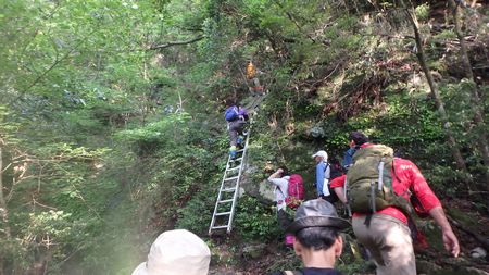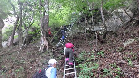 | ▼小積谷沿いを歩き、この後,ガレ場の急坂を登ります。 | ▼袖ダキ目指してハシゴを登ります。 | |