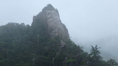 | ▼見返りの塔ヶ所から望む米岩(坊主岩)ですが、イルカ岩でもOK! イルカに見えたのは、大崩初参加のおっしーさんです♪ |