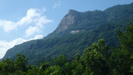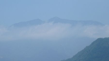 ▼峠近くの林道から望む、大崩山は尖がって見えます! 雲の上に浮かぶ大崩山です♪ |