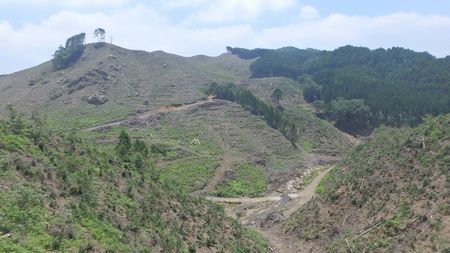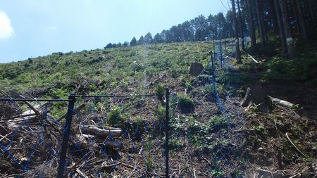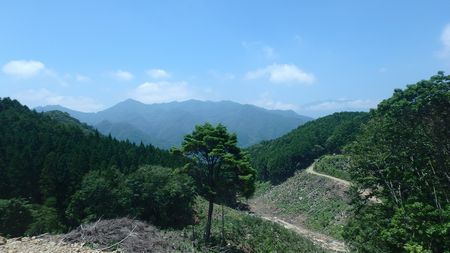 | ▼峠から望む和久塚方面は伐採後の植林帯です 手前の分岐林道から画像中央部の伐採境を上がりました |