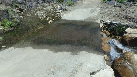 ▼峠から下ると水流が林道上を流れています♪ 左記の峠から見下ろす底部になります。 |