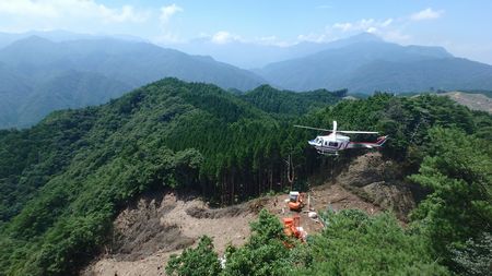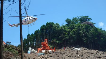 | ▼和久塚の露岩上から望む工事現場 歩いた稜線を一望・・・ヘリの尾翼付近のピークに三角点が有ります。 10分程の間隔で荷揚げヘリが飛来・・・長野峠方面から飛んできます |