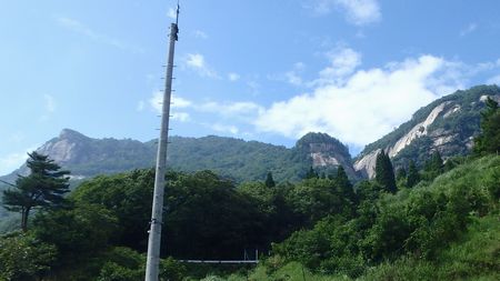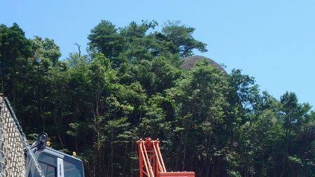 ▼三角点ピークと和久塚鞍部に大型クレーンの据付工事が始まっています 和久塚の露岩は展望良好♪ 画像、右方のタマゴ型の岩が展望岩です。 |