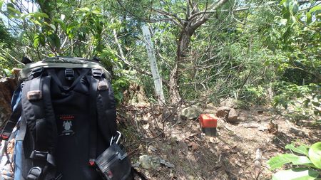 | ▼先に三角点ピークへ上がります。 白杭には、測量に必要な杭です。大切にしましょう! 地籍図根三角点と表記されています |