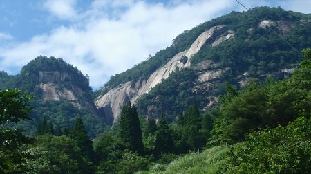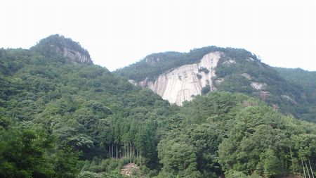 | ▼林道から望む、ヤカン落し | ▼大崩山登山口近くから望む、ヤカン落し | |