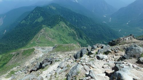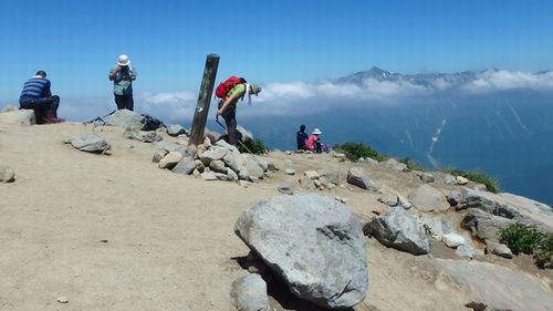 | ▼登山者の方から写して頂きました。 | ▼西穂高岳へ続く稜線を下り焼岳小屋からは上高地へ下ります。 | |