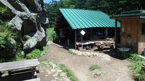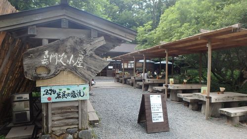 | ▼今宵の宿『嘉門次小屋』へ到着しました。 名物は岩魚の塩焼だそうです。 |
