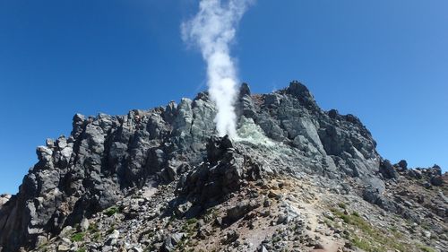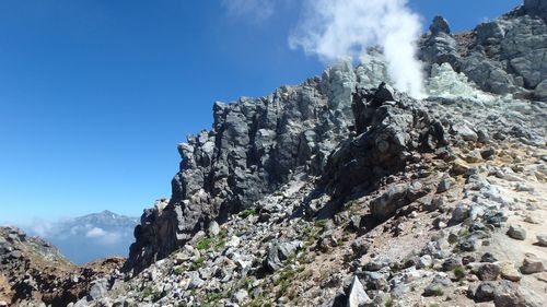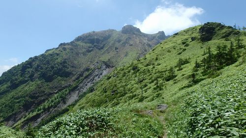 | ▼鞍部越しに、笠ケ岳(2898m)を望む | ▼鞍部から噴煙を上げる頂上部を見上げます。 さぁ〜山頂へ行きましょう! |