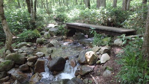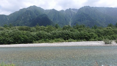| ▼右岸の遊歩道から望む、「六百山」でしょうか | ▼遊歩道脇を清流が流れます♪ | |