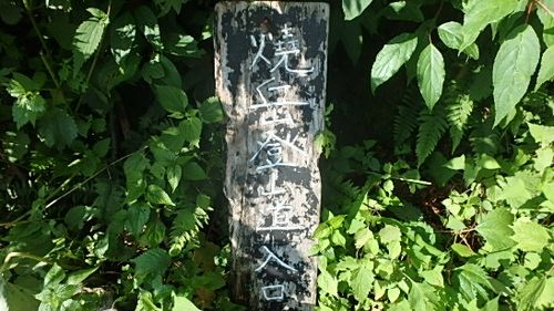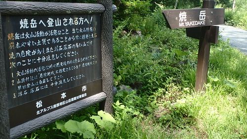 | ▼卜伝の湯から、50分でようやく焼岳登山口です。 | ▼目立たない登山道入口の標識 車が止まっていなければ見逃して通過しそうです! |