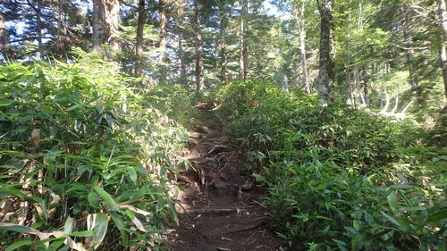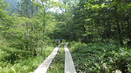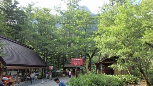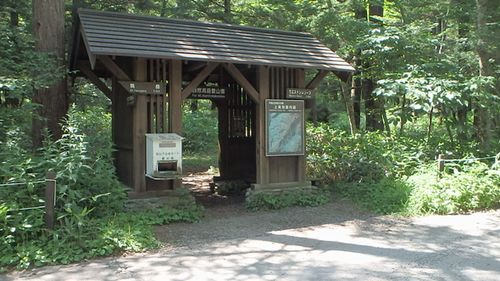 | ▼上高地からの登山口は作業道沿いに有ります。 | ▼車も通る作業道を河童橋方面へ歩きます。 上高地から西穂山荘へ上がる登山道の入口です。 |