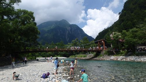 | ▼観光客でにぎわう、上高地の河童橋です♪ 上高地は標高1500mで雪解けの清流は冷たく暑い夏は別天地です! |
