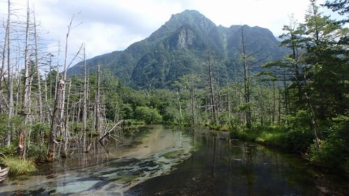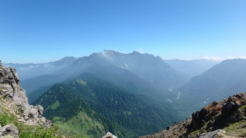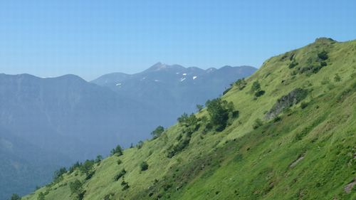 ▼梓川越しに、隠れた名山「六百山」「三本槍」「霞沢岳」です。 霞沢岳は明日登る、徳本峠から稜線伝いで登れるようです。 |