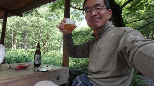 | ▼受付を済ませると先ずはビールです♪ 瓶ビール、大瓶:700円/本也 明神池の湧き水が足もとを流れるので涼しく岩魚が泳いでいます♪ |