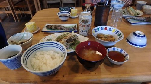 | ▼明神池の背後に聳える、明神岳 | ▼嘉門次小屋の夕食には、『岩魚の塩焼』が付きます♪ 明朝はAM5時発なので弁当or自炊になります。 |