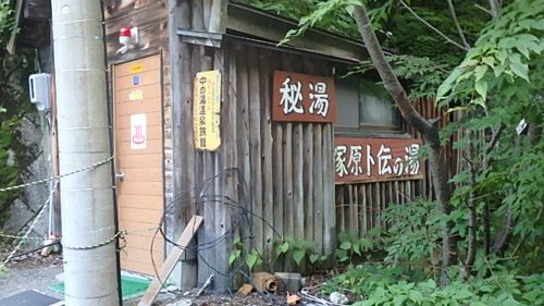 | ▼中の湯バス停近くの『塚原卜伝の湯(釜トンネル入口ヶ所) ここから旧国道を、約4.5km歩いて登ります。 |