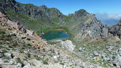 ▼北峰〜南峰の鞍部に到着です。 水量は少ないですが、懐かしいエメラルドグリーンです。 (霧島の新燃岳も噴火前には見事な同色が見られました) |
