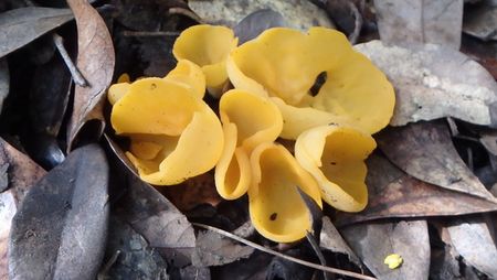 | ▼黄色いキノコの触感はまるでキクラゲ(登山道にて) | ▼刀剣山のツチトリモチ(登山道にて) | |
