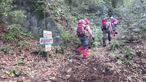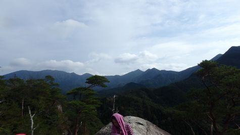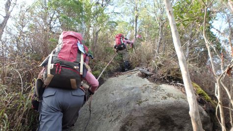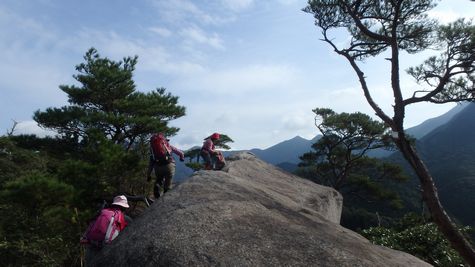 | ▼ザイルが設置されていますが傷みが激しいので注意! | ▼第T峰(685m)の岩上に到着・・・昼食を兼ねて休憩です | |