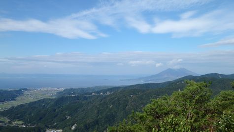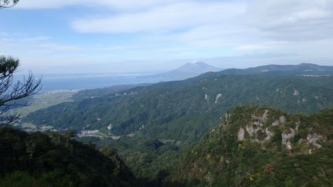 | ▼T峰からV峰展望所を俯瞰・・・桜島と鹿児島市街地も見えます | ▼鉾ケ峰へ下る途中から、V峰・展望所 (※T峰から鉾ケ峰へ下るルートが整備中?・・・踏み分け有り) |