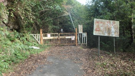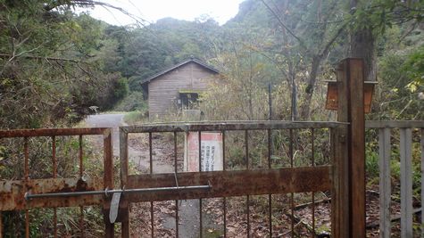 | ▼山小屋から猿ヶ城キャンプ場間は崩落・落石で車両通行不可 ⇒猿ヶ城キャンプ場方面から通行止め柵越に廃屋山小屋を見る。 (H24年の豪雨で林道が崩壊して通行止めです) |