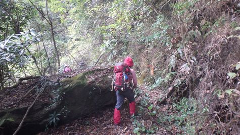 | ▼林道の上部よりシャワーが降り注いでいます | ▼大規模に崩落した林道ヶ所は下って巻きます | |