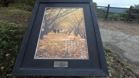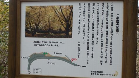 | 刀剣山からの帰路に県道71号沿いに有る『垂水千本イチョウ』へ寄りました。 垂水千本イチョウは、東京から昭和53年に帰郷された N氏ご夫妻が毎年少しずつ切り開き植樹されました。 垂水千本イチョウは、N氏ご夫妻が整備された『世間自然遺産の僕立公園』でした! |